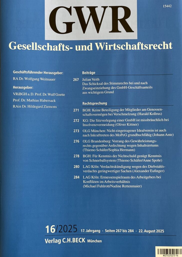 In einem Fachartikel in der aktuellen Ausgabe der Zeitschrift Gesellschafts- und Wirtschaftsrecht haben wir uns mit diesen rechtlichen Fragestellungen auseinandergesetzt (Julian Veith, Das Schicksal des Stimmrechts bei und nach Zwangseinziehung des GmbH-Geschäftsanteils aus wichtigem Grund, GWR 2025, 267). Der Beitrag ist auch auf beck-online abrufbar.